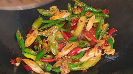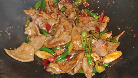 7.另起锅,加入少许油,油热后下入姜蒜和泡椒炒香,加入少许的豆瓣酱炒出红油。接着倒入大葱、青红小米椒,翻炒10秒钟左右,把配菜炒至断生,再倒入猪肝,沿锅边烹入调好的料汁,大火翻炒均匀,出锅之前再淋入少许的明油,再次翻炒均匀即可出锅。