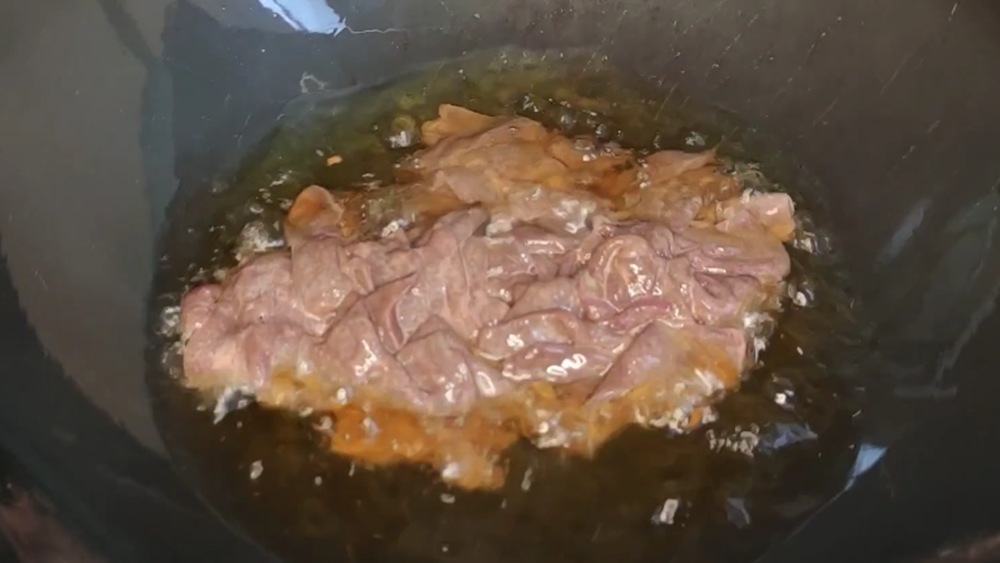 6.锅烧至冒烟,加入一勺油先滑一下锅,然后把油倒出来,再重新加入多一点的油,因为在家火力比较小,要先把猪肝滑下油,这样猪肝才不会炒老。油要烧得稍微热一点,下入猪肝,迅速给滑散,待猪肝微微变色后就倒出来控油。
