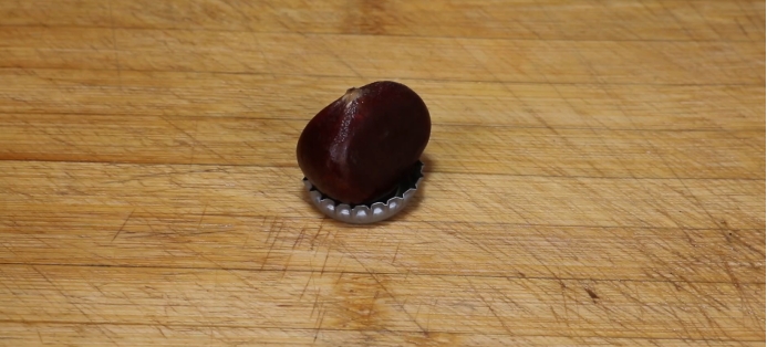 3、板栗的外壳又硬又滑,如果直接用刀给它开口的话很容易滑刀伤到自己的手,这个时候咱们就需要将板栗固定起来了,而固定的方法是非常简单,非常方便的,只需要准备一个啤酒瓶盖,将板栗放在瓶盖中即可。