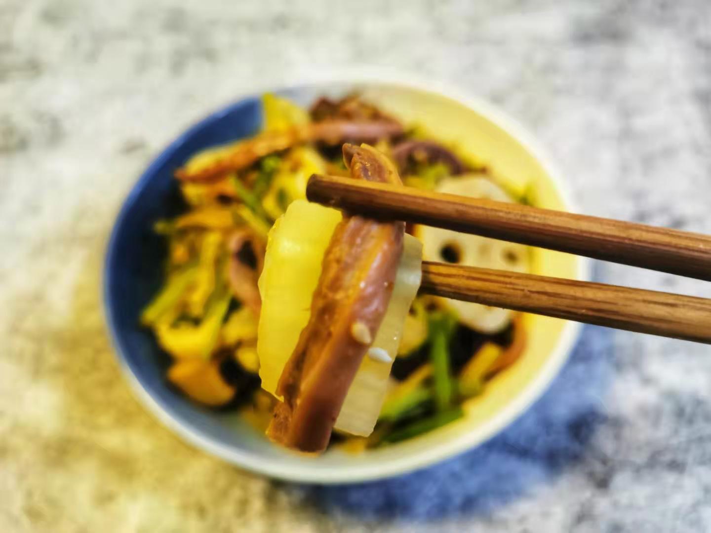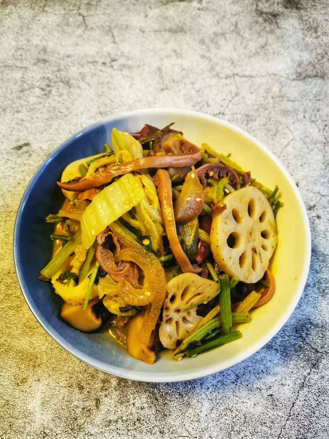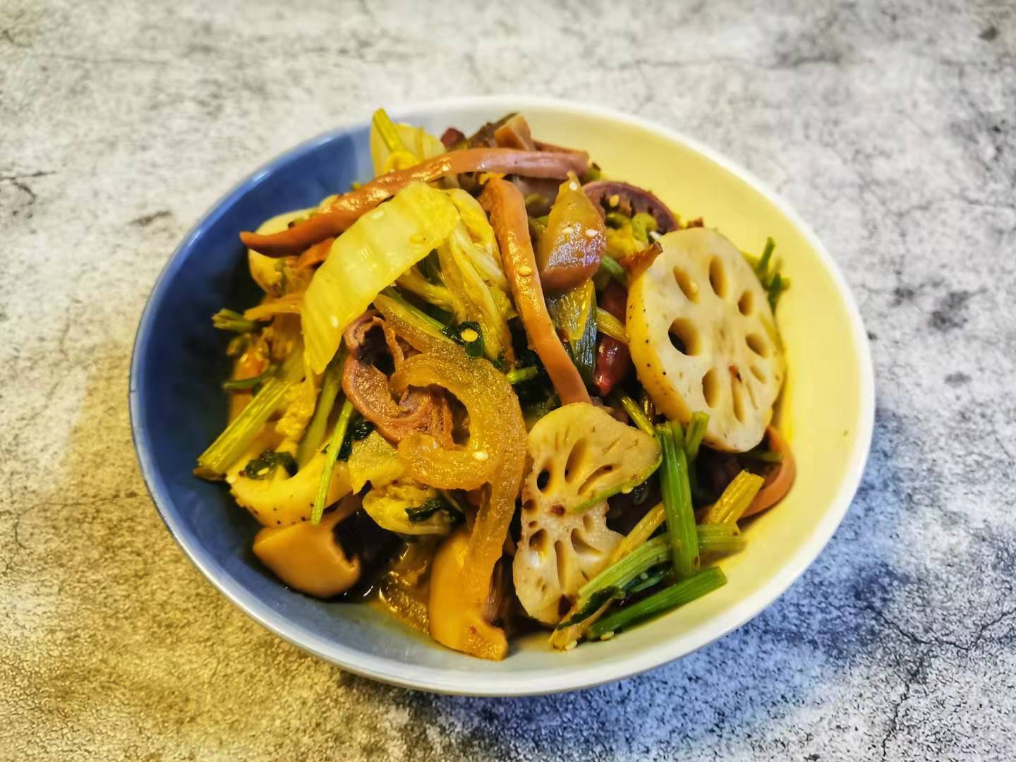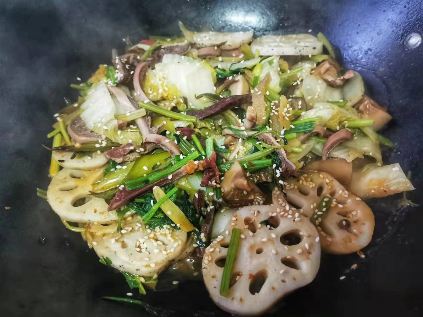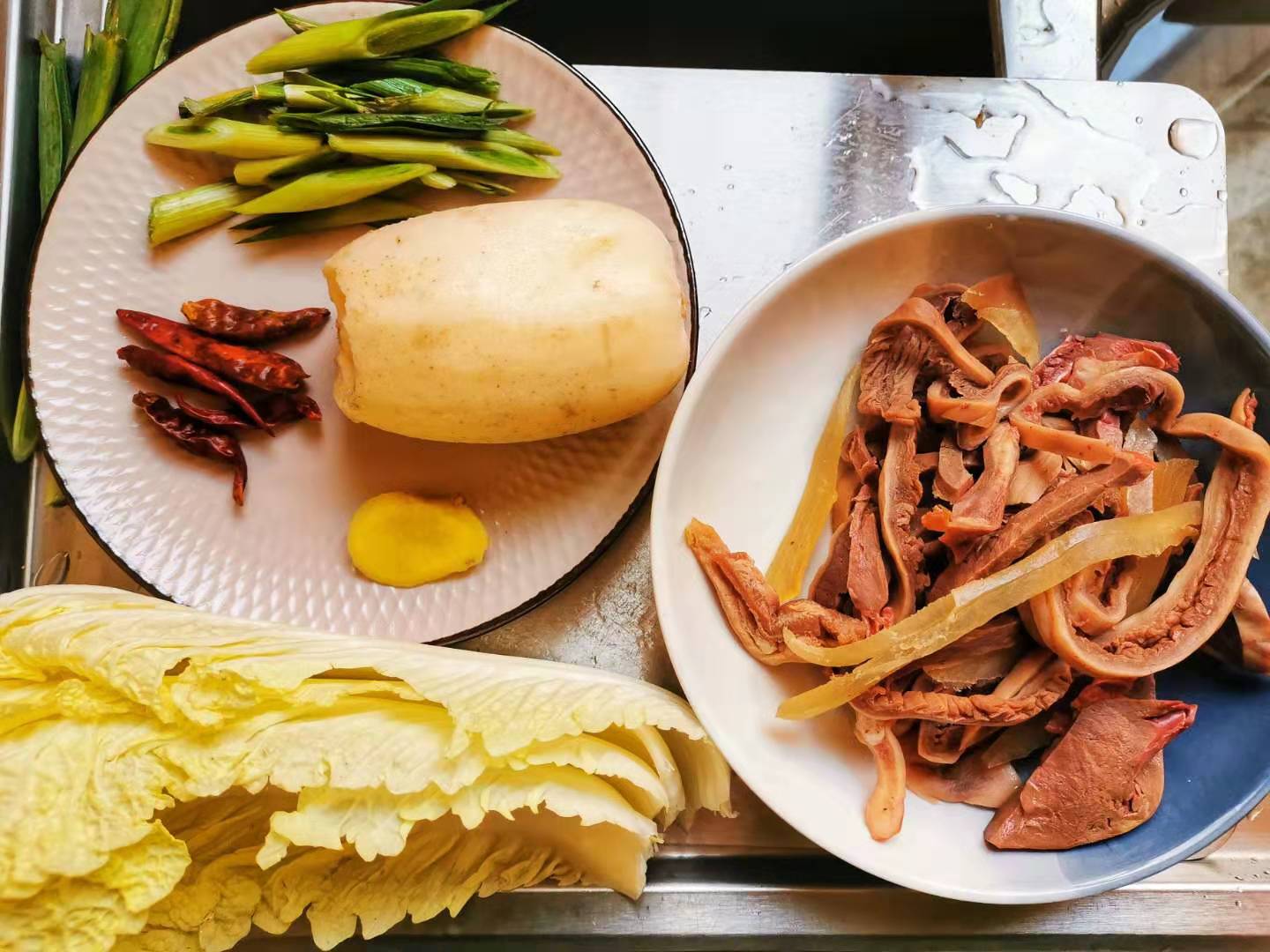 牛杂250克,莲藕150克,香菇150克,大白菜150克,大葱1根,大蒜2根,干辣椒3个,生姜1块,小葱3根,芹菜2颗,食盐适量,食用油适量,辣豆豉1匙,料酒1勺。