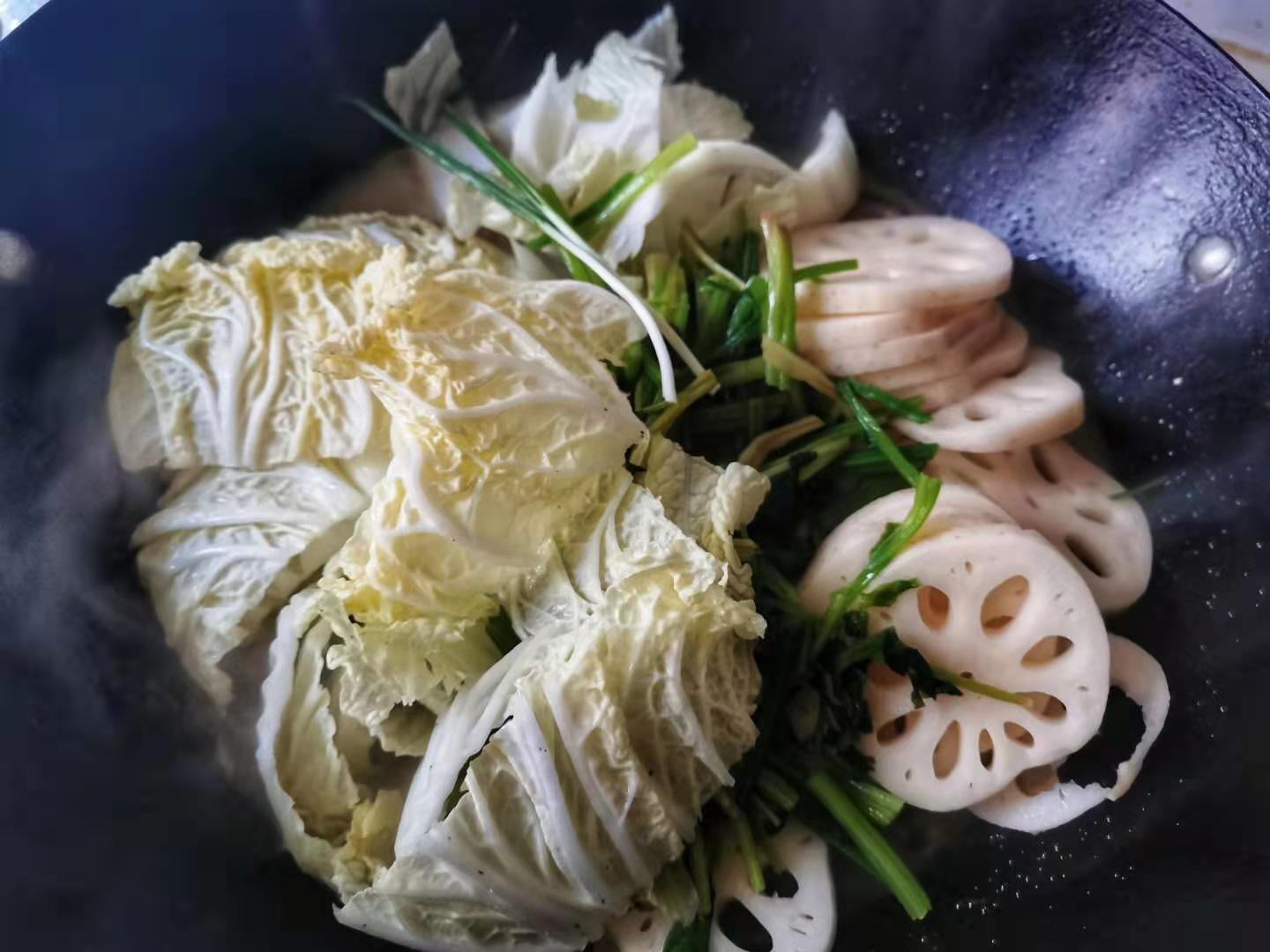 1、准备食材,将莲藕去皮,清洗干净切片,大葱和大葱分别清洗干净,切成段备用,大白菜洗净切块。