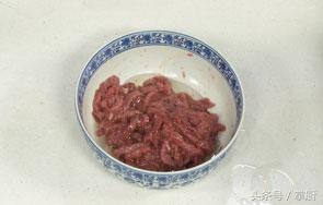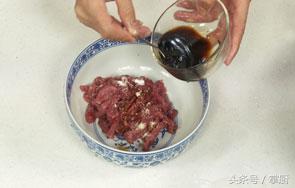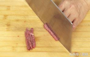 2 洗净的牛肉切成片,用刀背拍松,再打上花刀,改切成牛柳条。