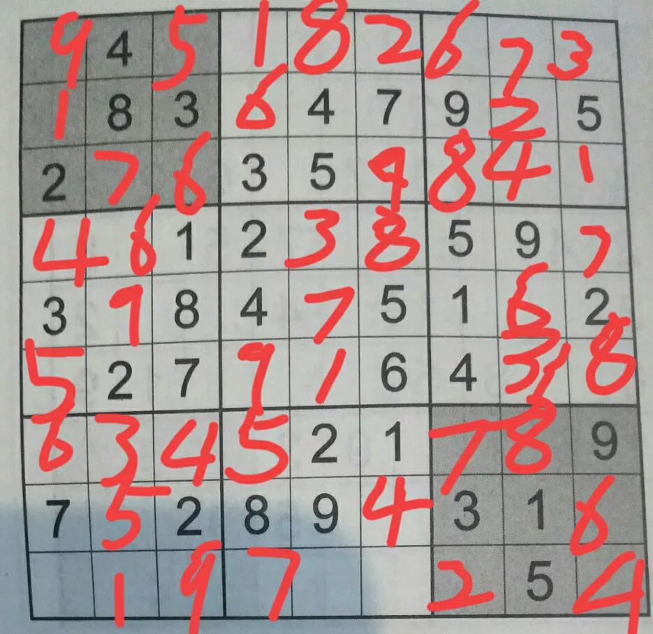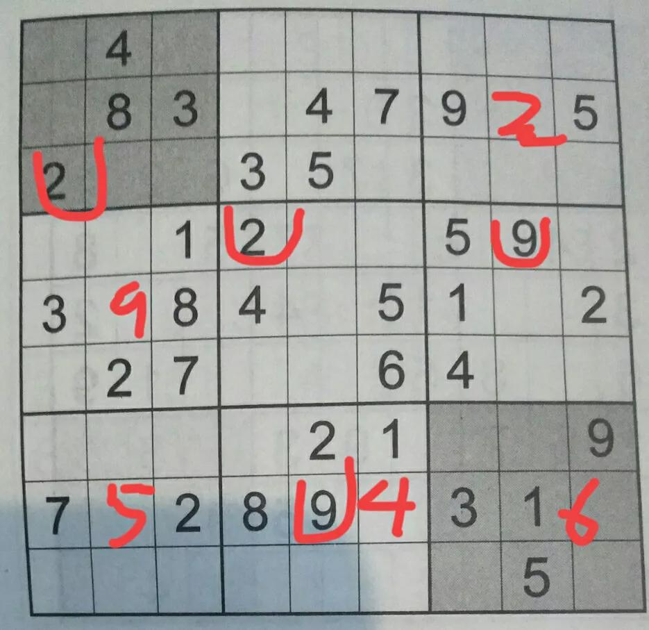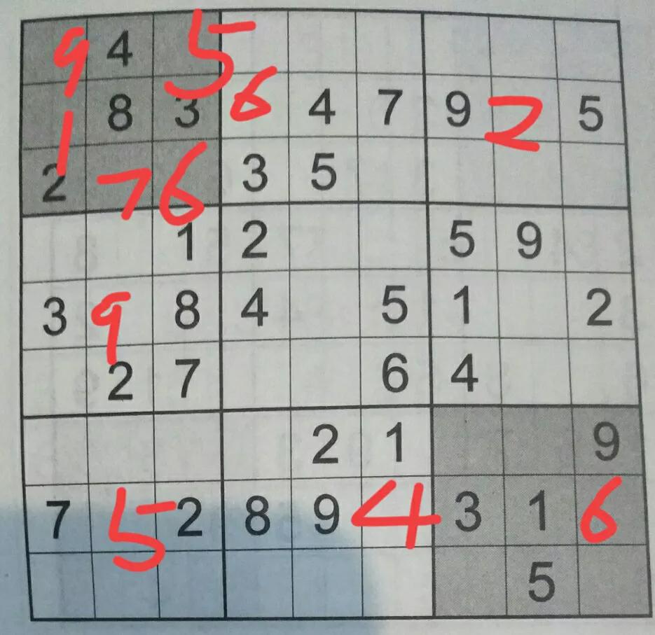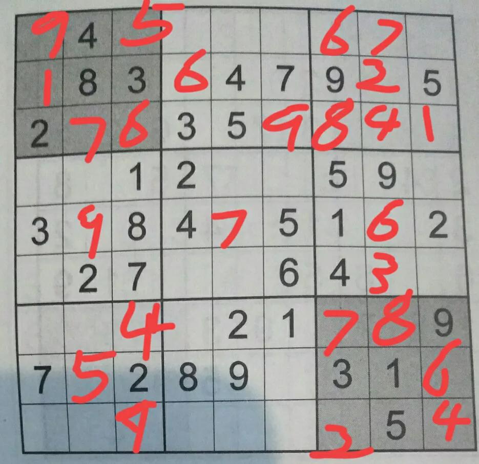然后剩下的比较复杂,就在小格子里写上可能的数字。