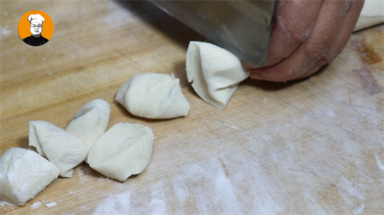 9、面团松弛时间到时,案板上撒上一层面粉防粘。再把面团拿出来揉成长条,然后切成大小均匀的面剂子,上面再撒上少许干面粉防粘。然后揉圆压扁,用擀面杖擀成饺子皮