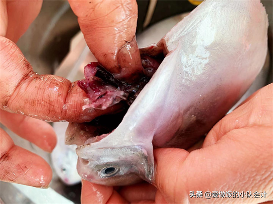 4、用手在鲳鱼腹部的剪开处,把鱼鳃和内脏拽出,清理干净。