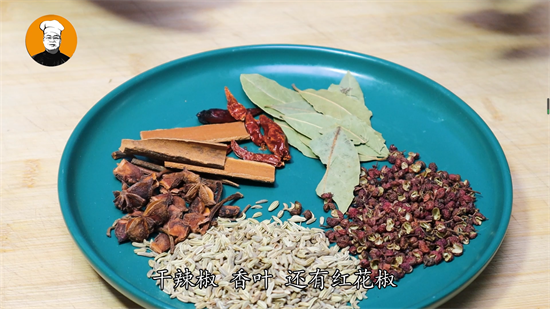 4、锅控干后放入小茴香、八角、桂皮、香叶、干辣椒、红花椒、30克食盐。把食盐和香料炒香,全程开中小火,炒到微微发黄,晾凉备用。五花肉放入干净无水无油的碗中