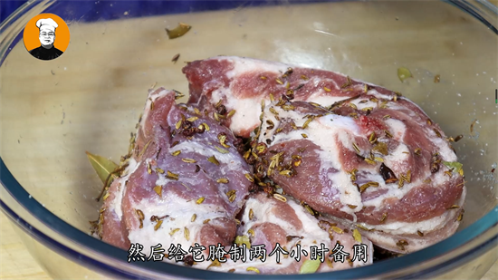 5、再把炒好的香料盐放进去,揉搓均匀,肉皮的地方要多擦会,去除肉腥味,再放入高度白酒,揉搓均匀,有去腥增香延长保质期的作用,然后腌制两个小时备用