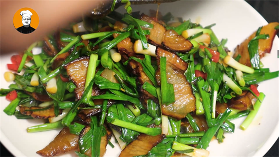 8、时间到时,酱油肉拿回来,切一点下来,清洗干净,然后切片。青大蒜根部拍扁切段。腊八蒜切片,小米辣切段。热锅倒油,放入酱油肉煸出油脂,再放入腊八蒜和小米辣爆香,然后放入青大蒜翻炒,再放入生抽、白糖、料酒,翻炒均匀,出锅装盆