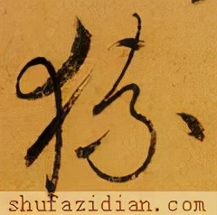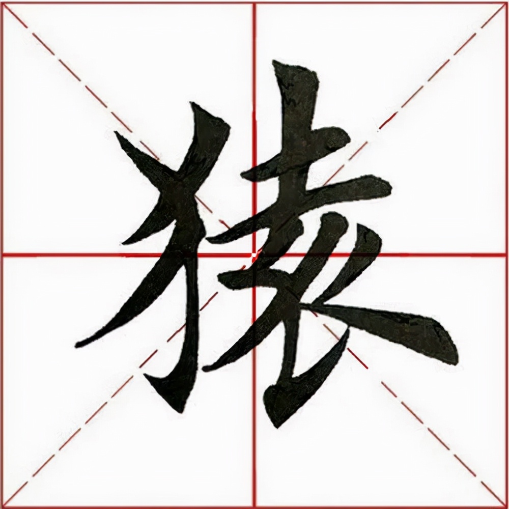 左部“犭”旁上收下展,不可写宽。首撇切笔起,撇身稍重,注意角度,不要长;第二笔弧弯钩露锋入笔,注意走向和轻重,行到撇笔开始拐弯向下弯行,不要写重,稍长,到位后跪笔弹锋起钩,钩不要大;最后撇笔起笔位置要靠上,行笔指向与首撇不同,稍长、稍轻。