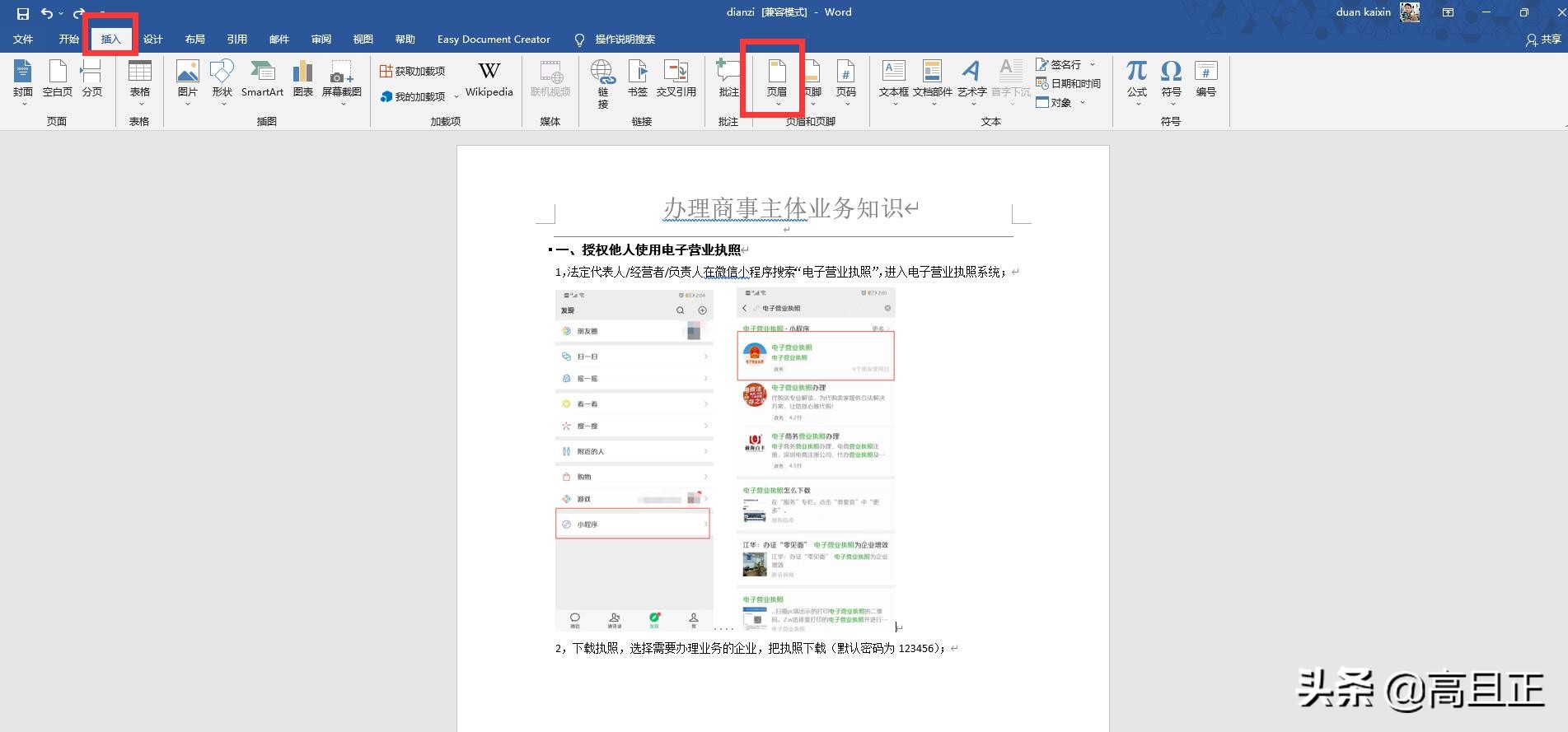 2、在页面工具栏里进去“插入”,找到“页眉”并点开: