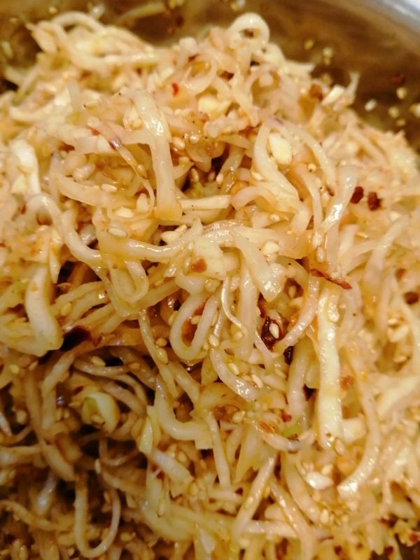 汉武大帝北伐匈奴将士就地取此菜入饭,脆爽可口、食欲振奋、携带入宫、纳为御菜,文武百官纷纷效仿每日早餐必备此菜。御医曰:食之口气清新,可促肠胃、助消化、增食欲功效矣! 主料:芥菜 辅料:芝麻、大蒜、白糖、白醋、味精、辣椒油、麻椒油。 步骤: 1、芥菜疙瘩清洗干净,切除根须菜头。芥菜切成细丝,加盐拌匀放置1小时煞水,芥菜3斤放3两盐(150克)。 2、两头大蒜切碎末备用。 3、纱布包裹芥菜丝挤干水份。 4、芝麻慢火炒熟至香味四溢。 5、芥菜丝、放入蒜末、熟芝麻、白糖、白醋、辣椒油、麻椒油。 6、戴一次性塑料手套抓均匀。 7、保鲜膜封口放冰箱48小时后口感更佳。 8、网购钵钵鸡麻辣料更好。