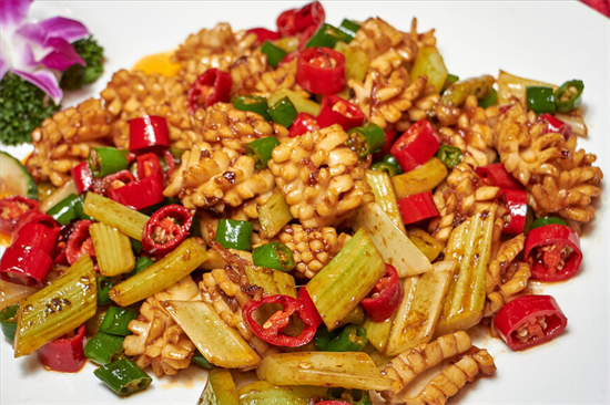 所需食材:鱿鱼、青椒、洋葱、生姜、豆瓣酱、盐、鸡精、生抽、料酒