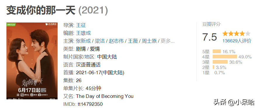 第一名:《变成你的那一天》豆瓣评分7.5分