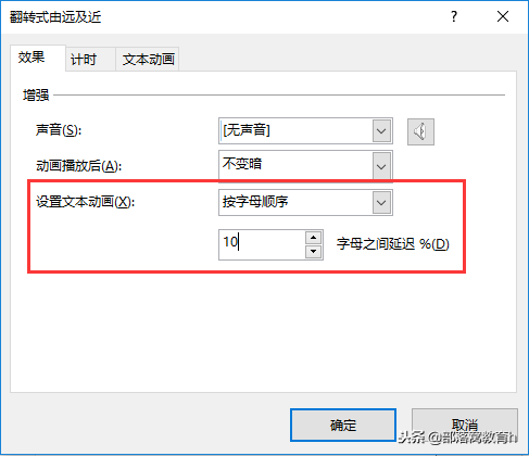 (3)打开“飞入”对话框,在“增强”栏下设置“动画文本”为“按字母顺序”,并根据自己的喜好调节字母之间的延迟百分比,然后单击“确定”按钮。