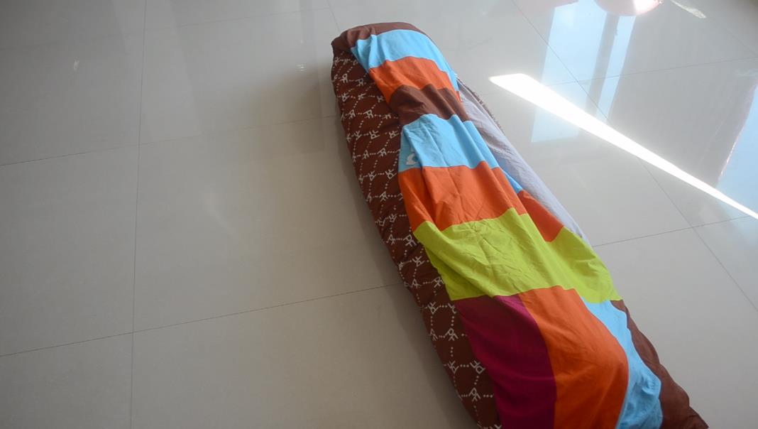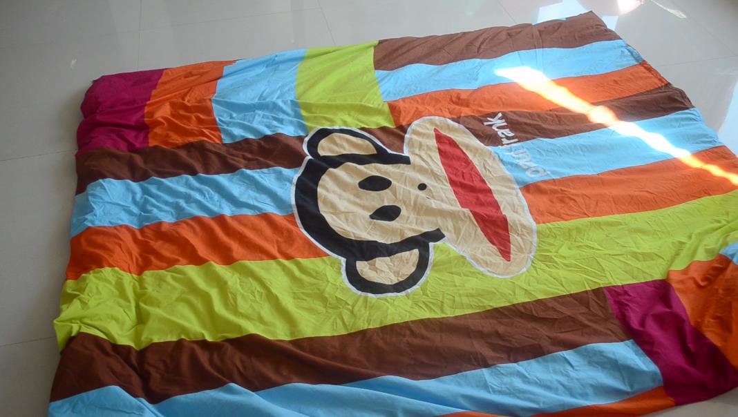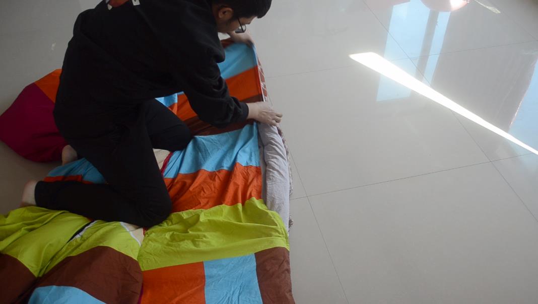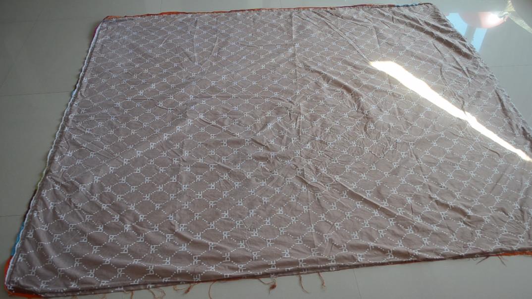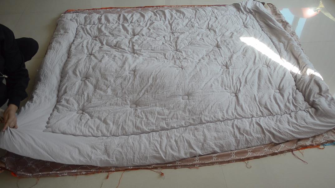 第二步,把厚棉被铺平在这个被套上面并且将其对齐,特别是四个角落的位置。