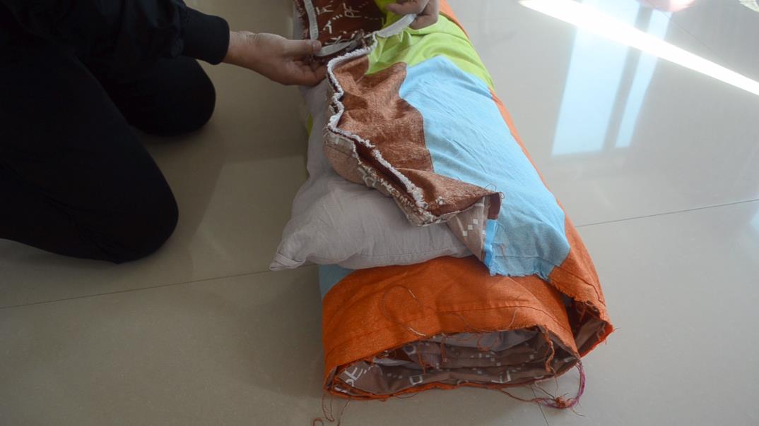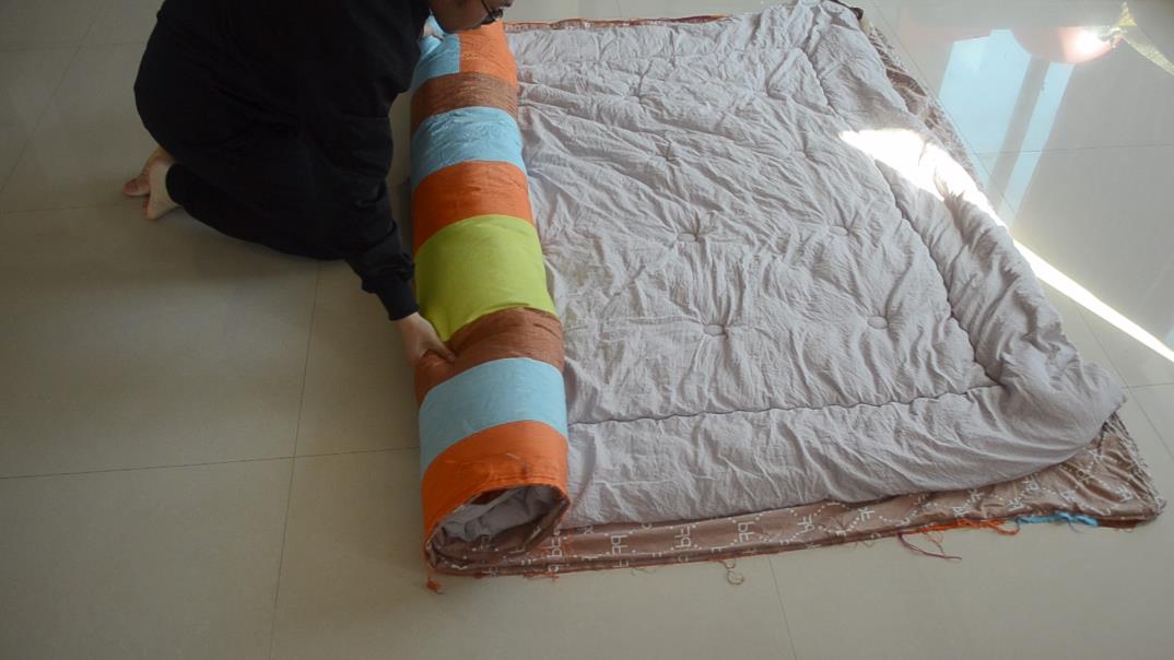 第三步,我们找到被套拉链的一侧位置,并且在它的对立面位置把棉被和被套一起卷起来。此时,我们可以看到被套拉链的一侧会在上方位置。