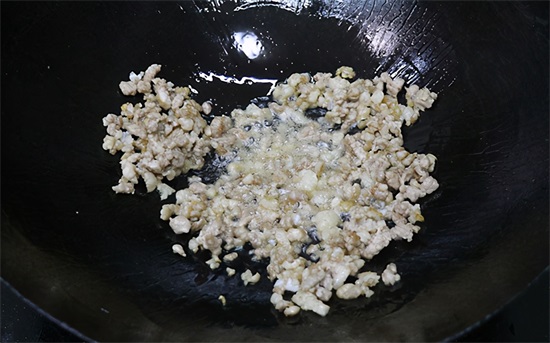第五步:锅内留一点点底油,然后下入肉末,把肉末慢慢煸炒至出油,变得酥香;继续炒至肉末金黄的时候,加入少许蚝油和生抽酱油,并继续翻炒均匀,炒出酱香味。
