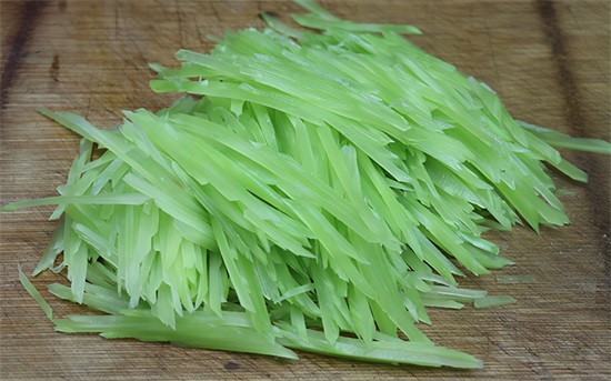 第一步:把莴笋的根部来切一下,外表硬一点的地方用刀削去,然后再用削皮刀削掉外皮;接着把去好皮的莴笋先切成片,再切成粗细均匀的细丝备用。