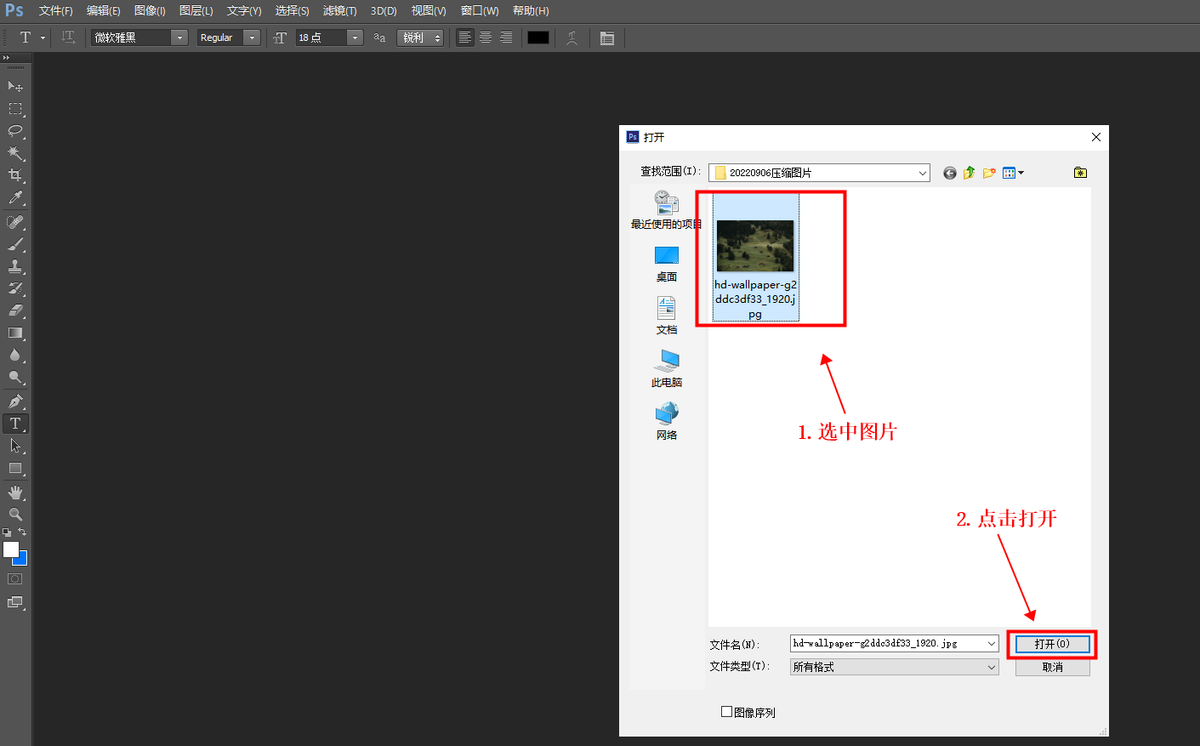 其次,在弹出的文件选择界面选择需要压缩的图片,点击