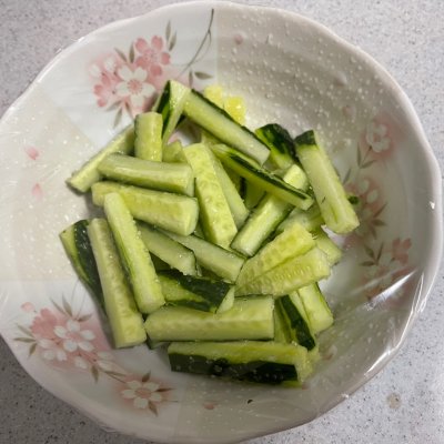 1、1、洗净备好食材,黄瓜切条,加少许糖腌制如图,保鲜膜包好,放冰箱冷藏10分钟做左右,这样的黄瓜更加鲜甜脆;