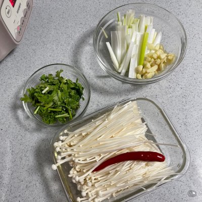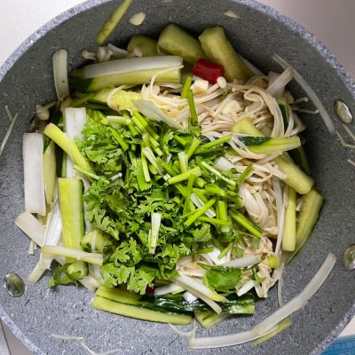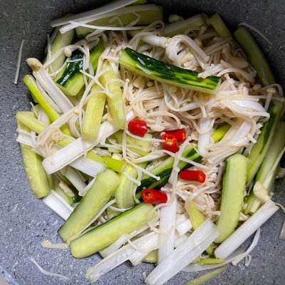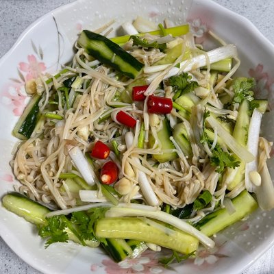 金针菇 200克 黄瓜 1个 小米辣 1个 大葱 1根 香菜 1颗 酱油 适量 糖 适量 醋 适量
