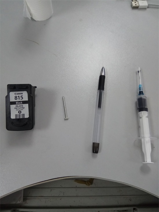 所需工具:一支水笔(黑色),一个注射器(药店有售),一个空墨盒(我的是佳能815黑色),还有就是卫生纸。