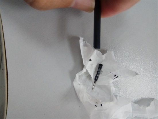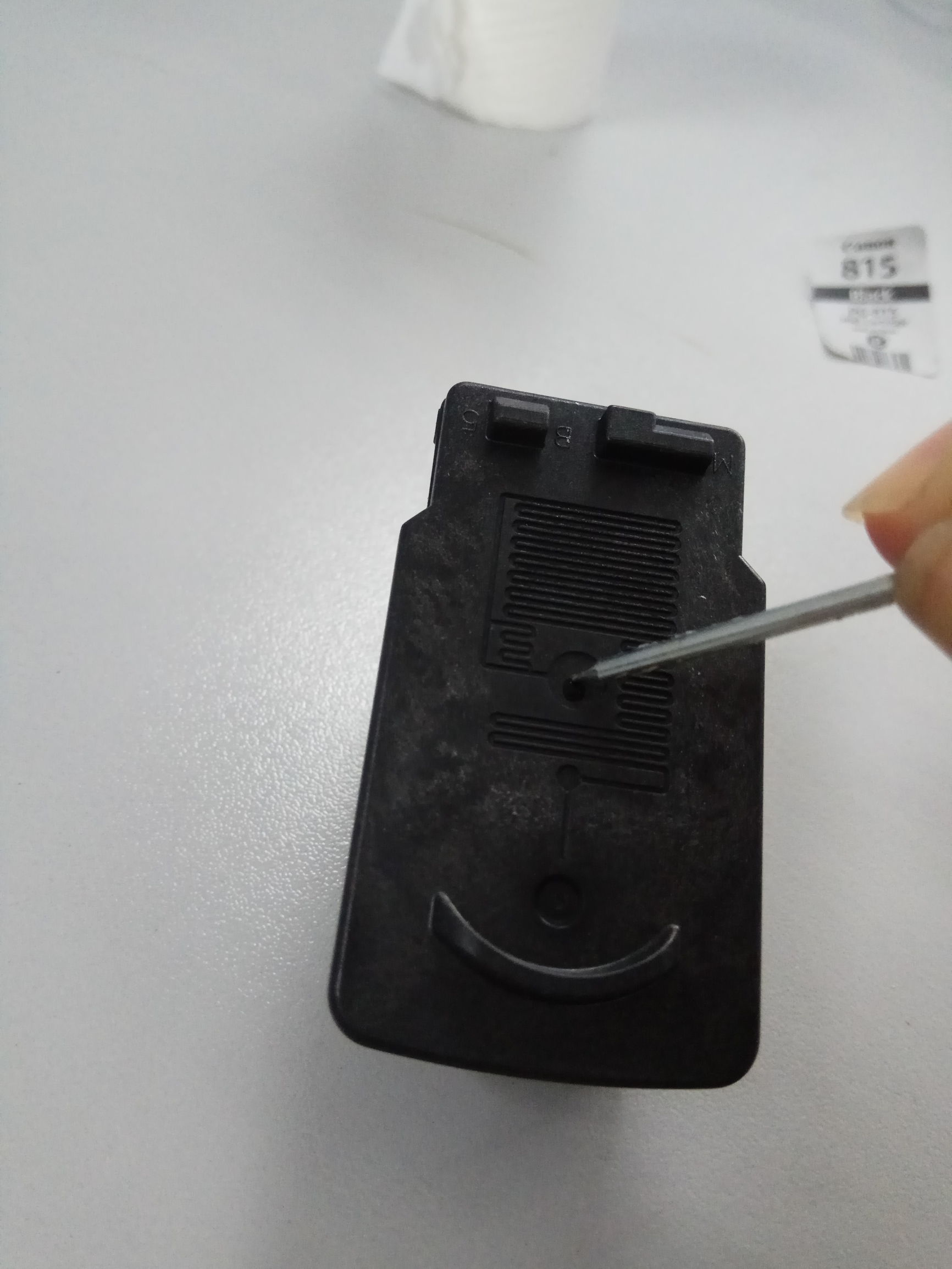 撕掉贴纸,用针尖硬物扩大加墨孔