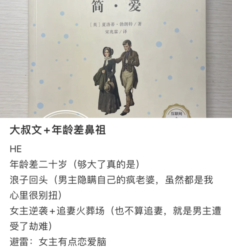 比如《简·爱》,不就是一个女主逆袭+追妻火葬场的大叔文吗?女主还有点恋爱脑,避雷了。