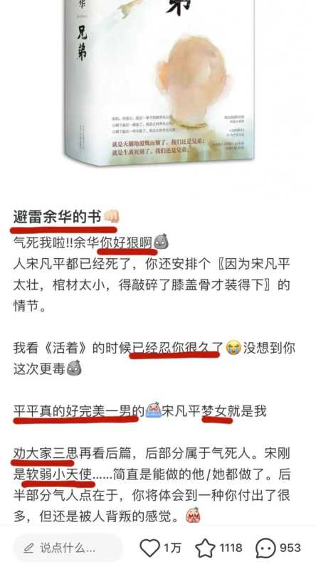 发帖人称,自己看了余华写的《兄弟》,快要被气死了,因为情节太虐了。