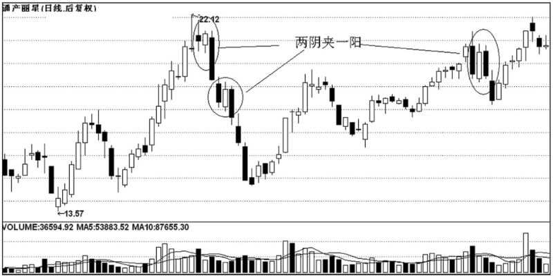 (2)两阴夹一阳出现在跌势中,继续看跌。此时多方的力量已经十分微弱,下跌途中虽有反抗,但却改不了下跌的大局。