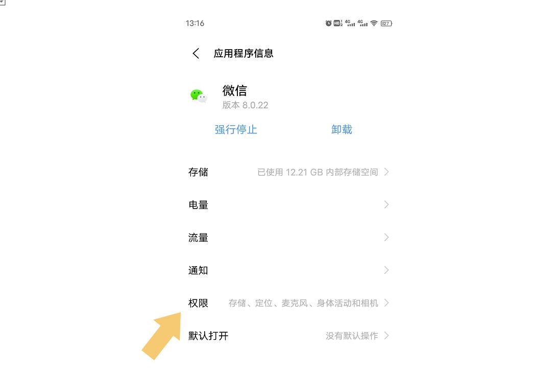 点击打开“微信”应用,在弹出的界面里选择“权限”。如下图: