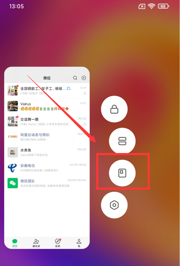 如果想让微信显示成小窗口,就在上面这个后台列表中,用手指长按微信,这时微信右侧或左侧就会出现4个按钮(如下图)。