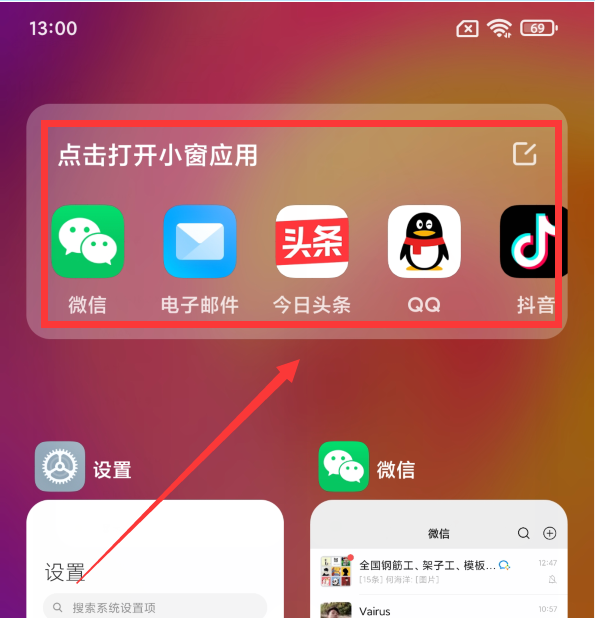 在这个界面的左上角,有一个“小窗应用”按钮(如上图),点击这个按钮,就会显示所有能小窗口的应用软件(如下图),可能左右滑动查看更加应用。