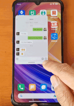 在手机上打开某个应用软件,然后,从手机的底部边缘向上拖动这个软件,一直拖到屏幕的顶部,然后放开手机,这个软件就会以“悬浮窗”形式显示在屏幕的右上角(如下图)。
