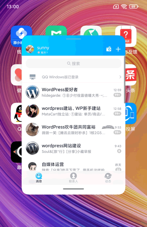 想让哪一个应用显示为小窗口,就点击一下它,如:点击QQ,QQ就会以小窗口形式显示在屏幕的中间(如下图)。