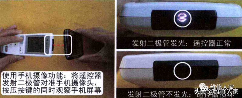 ② 在手机屏幕上观察发射二极管不发光,说明遥控器损坏。
