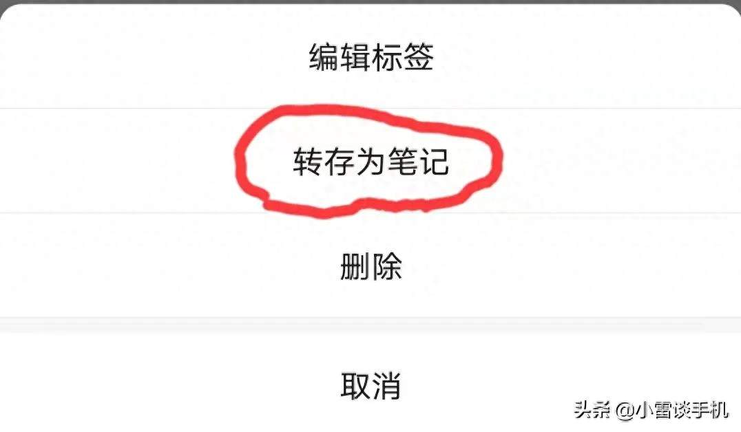 4、在手机底部弹出来的菜单中点【转存为笔记】