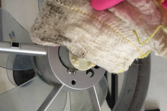 2、拆好后,先清理风扇叶。先拿纸巾将风扇叶以及周边的最厚的一层灰尘擦掉,接着用拧干的湿毛巾擦拭风扇叶和周边,擦得时候可以沾点醋,擦拭3遍以上,直至干净。