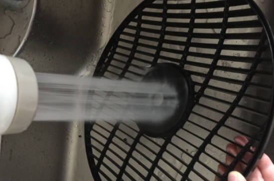3、接下来清洗风扇的网罩,先用水简单冲洗一下,再拿小刷子或者毛巾将网罩上的污渍清洗干净。清洗的时候可以使用除污剂,效果会更好,洗好后擦干水分放到阴凉处晾干。