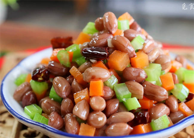 凉拌花生米:这个菜的制作方法也是特别简单,把花生米提前用凉水浸泡一晚。锅里面烧水把画,泡好的花生米,凉水下锅,加入姜片,葱段,花椒,大料和适量盐,大火煮开转成小火,煮15分钟。煮好的花生米捞出里面的料渣浸泡两个小时。再准备适量胡萝卜,芹菜,黄瓜等切成丁。把花生米捞出来用清水冲洗两遍,放在切好的蔬菜丁里面,加入适量盐,花椒油,味精搅拌均匀。就是非常好吃的小咸菜,早餐喝粥或者是平时喝点小啤酒都非常不错。