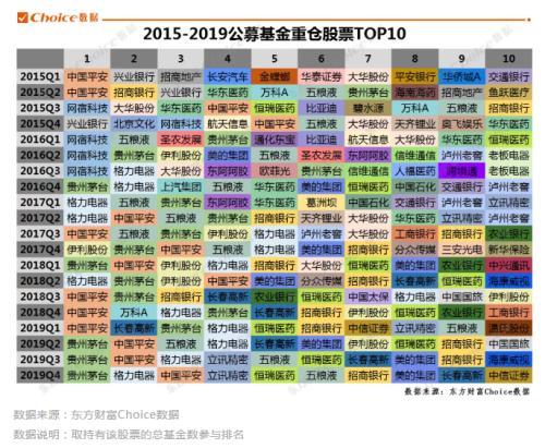 从2016年开始,贵州茅台就没有缺席过公募基金持有的股票TOP10。Choice数据显示,在20个季度里面,贵州茅台现身次数为17次排名第一,中国平安则紧随其后。