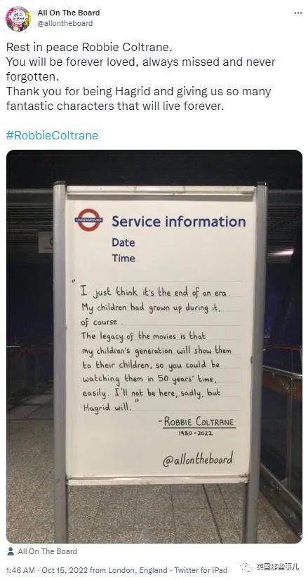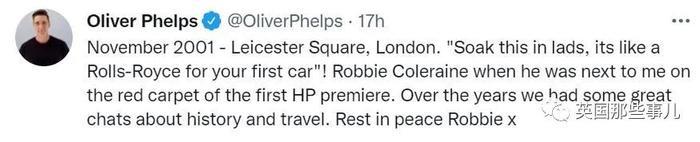 “得知哈利·波特演员罗彼·考特拉尼今天去世,我感到很难过。