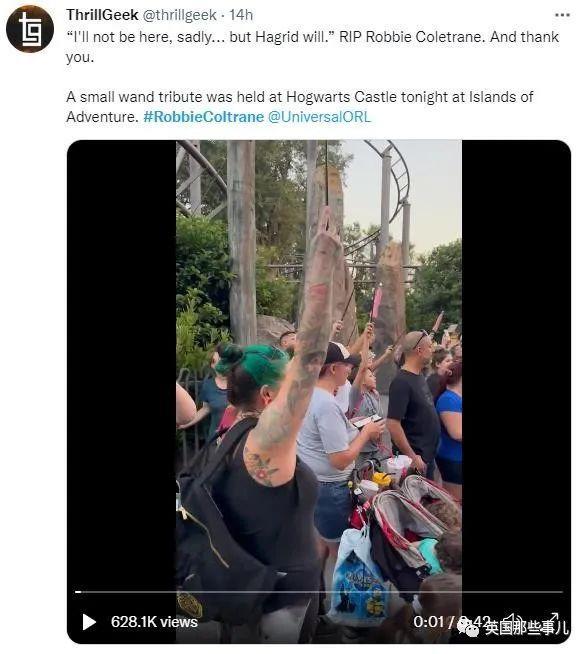 而在美国环球影城的霍格沃兹城堡前,哈迷们纷纷举起自己的魔杖以及海格同款雨伞,用魔法世界的方式对罗彼表示哀悼。
