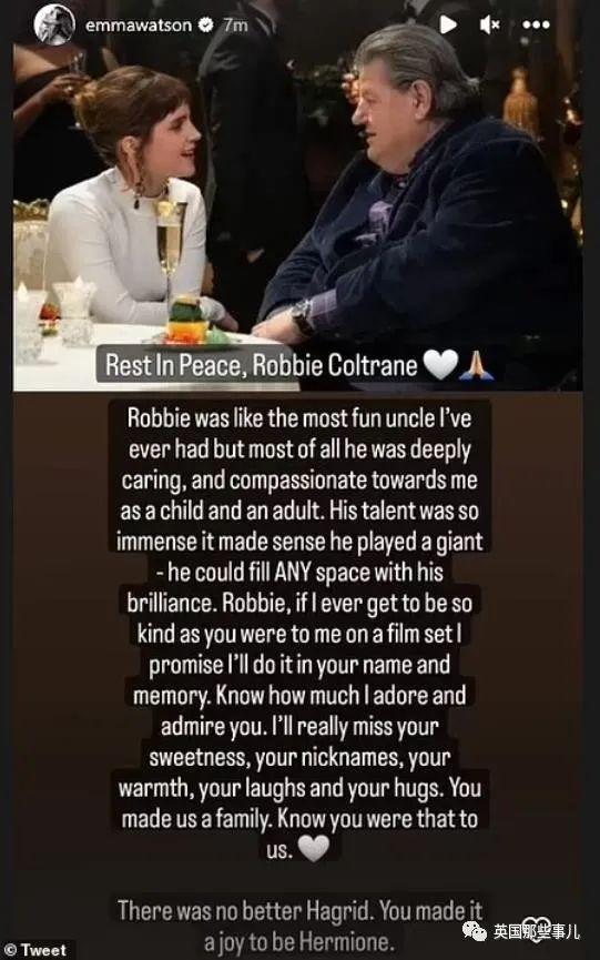并赞扬他扮演的海格“为全世界的儿童和成年人带来欢乐”。