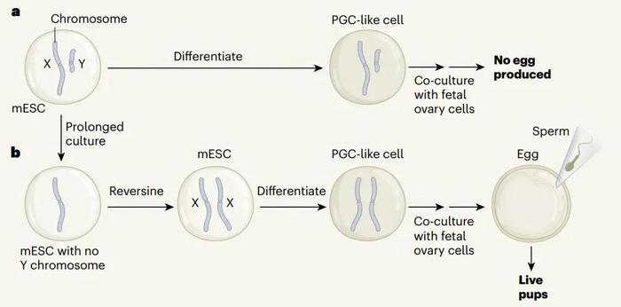具体来说,他们利用干细胞技术先对雄性小鼠的皮肤细胞进行了重编程,使其回到胚胎发育早期状态,也就是创建出诱导性多能干细胞。在体外长期培养过程中,大约6%的多能干细胞会自发完全丢失Y染色体。通过监测每个细胞中的染色体数量,研究人员先找出这些只剩一条X染色体的多能干细胞,然后采用药物“逆转素“(reversine)对它们继续进行培养。这种化学物质会扰乱细胞分裂过程中的“质检”过程,导致X染色体可能发生复制。