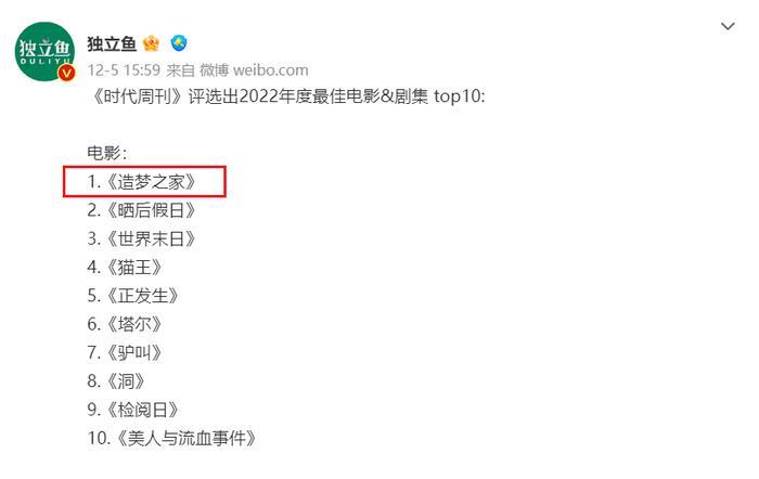 位列《时代周刊》的「2022年度十佳电影」之首。