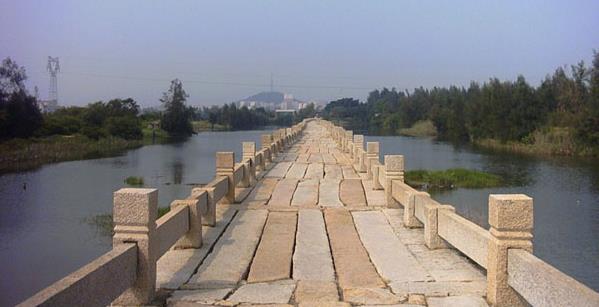 它是我国现存最长的海港大石桥,全桥长2255米,宽3-3.8米,桥墩361座,桥上有水心亭、楼亭、中亭、雨亭、宫亭等五座。桥东头有白塔,高22米,五层六角空心砖塔,外涂抹白灰。高塔长桥,相映成趣。