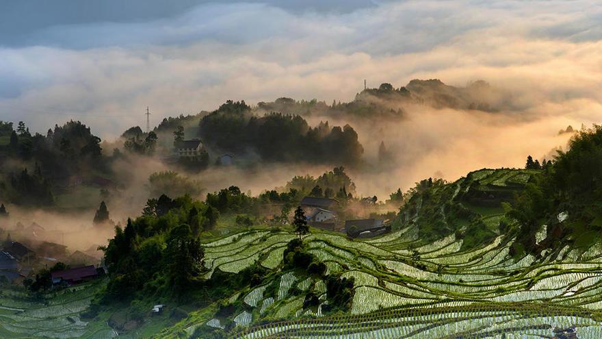 四季景观:“春飘条条银带,夏滚道道绿波,秋叠座座金塔,冬砌块块白玉”。九曲云环是云和梯田的最好比喻,九曲是梯田的轮廓,云环是晨昏的云海。云和梯田美在错落有致、长短不一、静如波纹、忽即忽离、云里雾里。