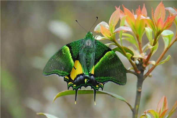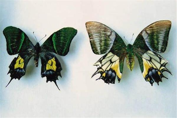 金斑喙凤蝶还分为雌性和雄性,雌性雄性的模样是不同的,雄性整体的颜色为翠绿色,底色是黑褐色,身上有很多的花纹,以黄色和绿色为主,雌性的蝴蝶绿色和黄色就相对少一些,主要是白色,两者的外型特点是相反的。
