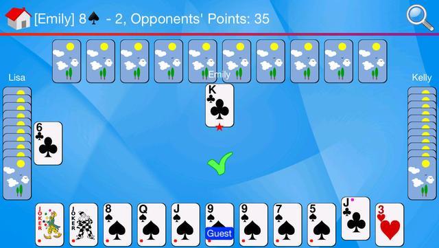 当每人都抓满25张牌时,剩余8张留给庄家,庄家再垫8张底牌,然后由庄家先出牌,可以出前面说过的任何一种牌型。每一轮根据前面的大小判断方法判断出本轮谁的牌最大,他就获得下一轮的出牌权。若打家本轮大,则牌面是5、10、K的分值就作废。若闲家本轮大,则牌面是5、10、K的分值就加入闲家的得分。